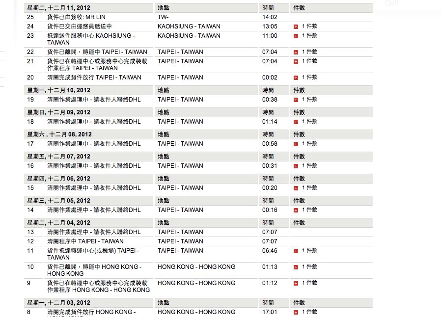 這段期間我一直有使用 DHL 的貨件追蹤查詢功能來掌握目前的狀況,直到 12/7 一直是「清關作業處理中 – 請收件人聯絡DHL」,如果有上網爬過文的就知道,當你發現你的 DHL 出現此訊息時,大概就是被卡關了。